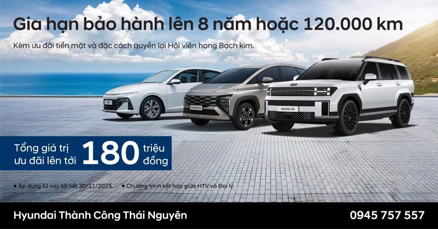 Tháng 11/2025, Liên doanh ô tô Hyundai Thành Công Việt Nam (HTV) chính thức triển khai chương trình ưu đãi kép hấp dẫn “Bảo hành 8 năm – An tâm vận hành” cùng nhiều hỗ trợ chi phí sở hữu khác cho các mẫu xe Palisade, Santa Fe, Tucson, Creta, Accent, Stargazer và Grand i10.